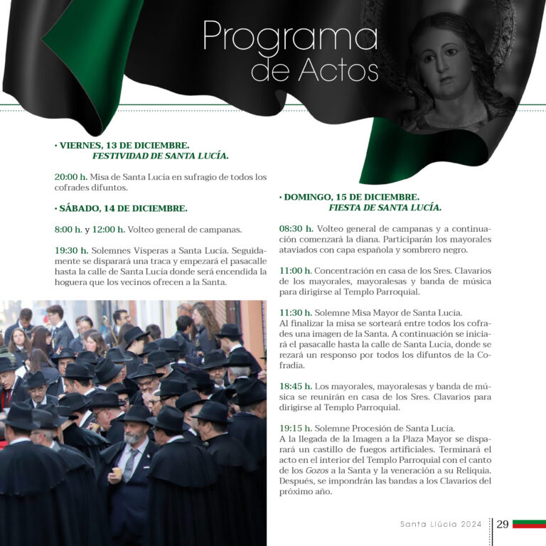 La festa consta de cercaviles pels carrers del municipi, en la qual no pot faltar el carrer de Saint Lucia, molt present aquests dies, diana, esmorzar, Solemne Missa Major i #a la vesprada la processó.
