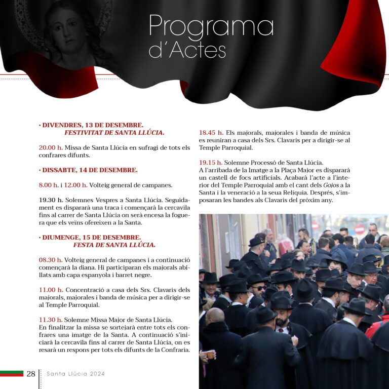 La festa consta de cercaviles pels carrers del municipi, en la qual no pot faltar el carrer de Saint Lucia, molt present aquests dies, diana, esmorzar, Solemne Missa Major i #a la vesprada la processó.