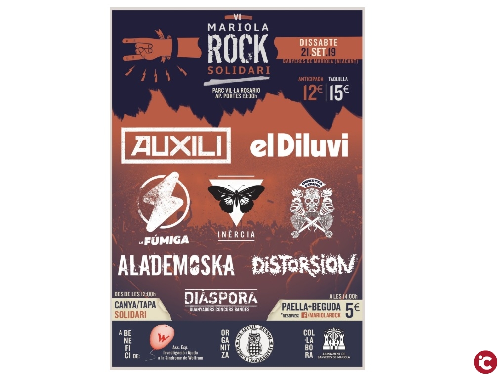 El 21 de setembre es desenvoluparà el IV Mariola Rock Solidari 2019 a Banyeres de Mariola. Aquest festival comptarà amb les actuacions d’Auxili, El Diluvi, La Fúmiga, Alademoska, Distorsió, Diàspora i Orkesta Paradís. Enguany els beneficis aniran a favor de l’associació per a la investigació i ajuda a la Síndrome Wolfran. Una malaltia poc comuna que necessita finançament per a poder avançar en el seu diagnòstic i tractament.