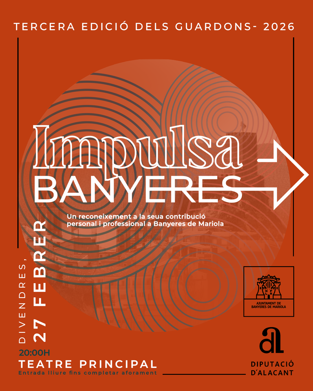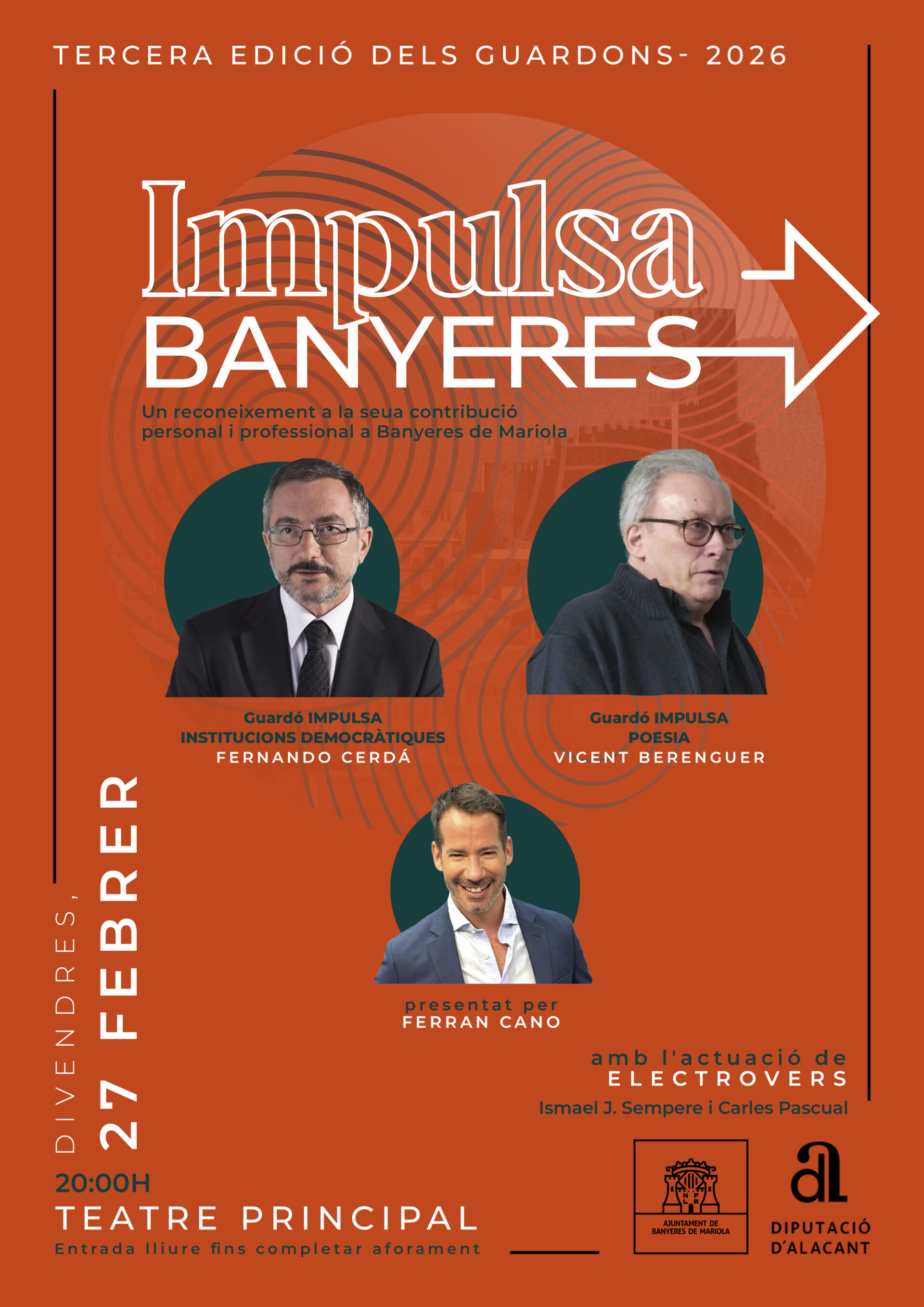 Sota el lema Impulsa Banyeres, l’acte ha reconegut la contribució personal i professional a Banyeres de Mariola. En esta edició, el Guardó Impulsa Institucions Democràtiques ha sigut per a Fernando Cerdá, mentre que el Guardó Impulsa Poesia ha reconegut Vicent Berenguer.