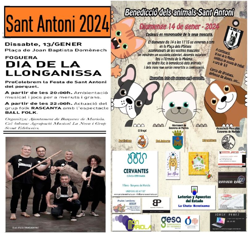Ja el diumenge al matí s´ha realitzat la desfilada i benedicció d’animals, organitzat per l’Associació de Mascotes de Banyeres de Mariola (AMABA), sent la concentració a les 11,15 del matí des de la Plaça dels Plàtans amb un xocolate calent i després emprenent el recorregut fins a l’ermita de la Malena, on s´ha procedit a la benedicció. En l’acte s´han lliurat també els tradicionals pans. En l’acte ha participat la Colla de Dolçaines El Brassal.