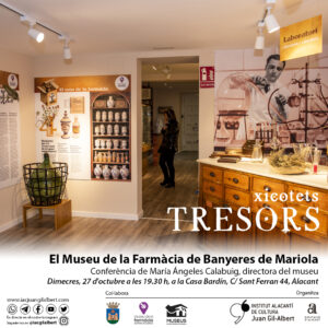 Por otra parte, y dentro del ciclo ‘Pequeños tesoros’ dedicado a los museos de la provincia, la directora del Museo de la Farmacia de Banyeres de Mariola, Mª Ángeles Calabuig, desgranará los detalles de este centro cultural a través de una conferencia teórica en la Casa Bardín, el miércoles 27 de octubre, a las 19:30 horas.