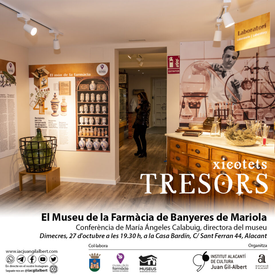 Por otra parte, y dentro del ciclo ‘Pequeños tesoros’ dedicado a los museos de la provincia, la directora del Museo de la Farmacia de Banyeres de Mariola, Mª Ángeles Calabuig, desgranará los detalles de este centro cultural a través de una conferencia teórica en la Casa Bardín, el miércoles 27 de octubre, a las 19:30 horas.