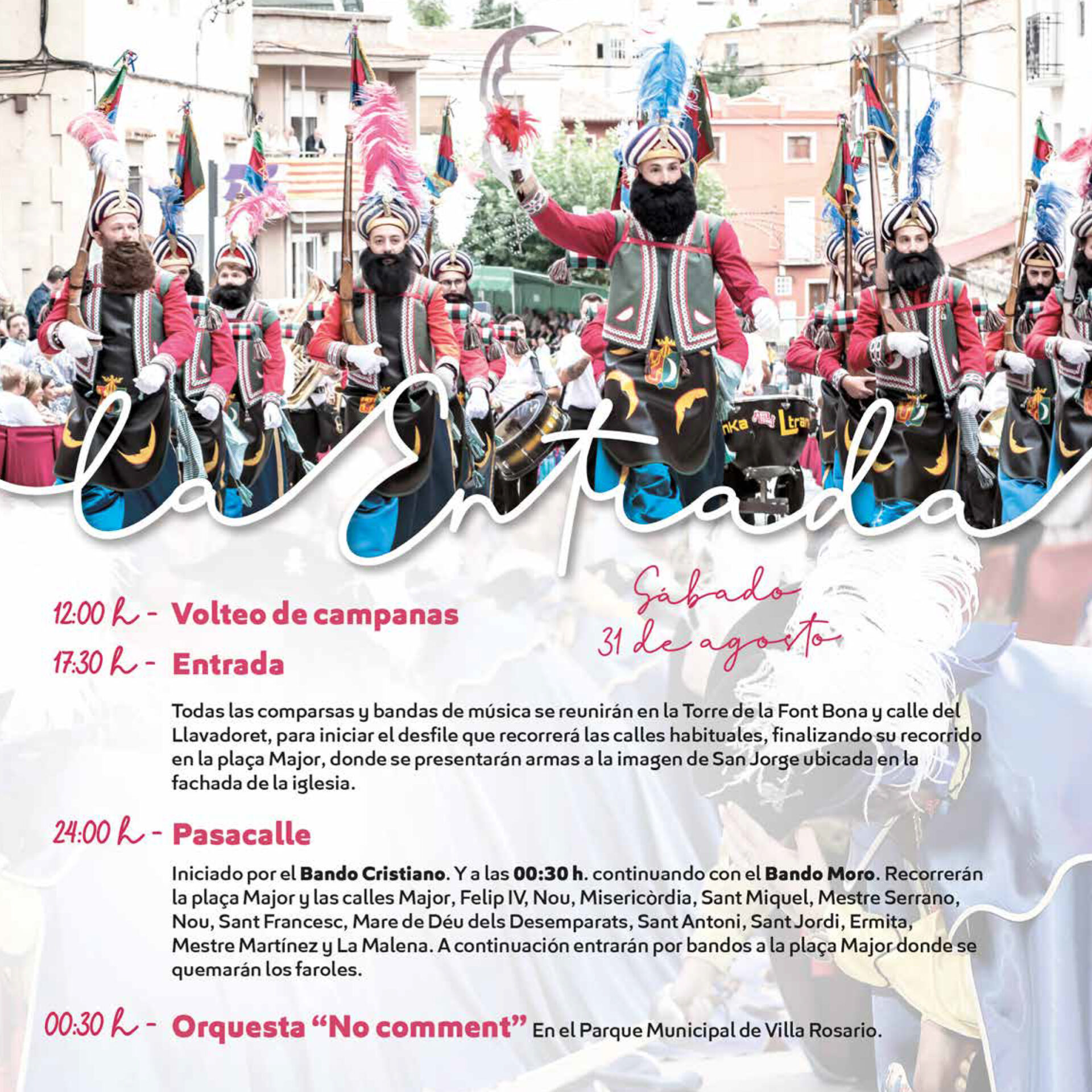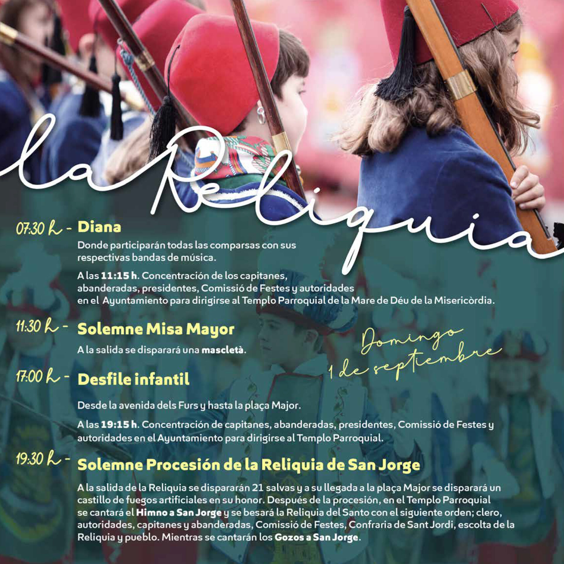Dissabte, 31 de setembre, a les 17:30 hores, serà l´Entrada. Diumenge, 1 de setembre, a les 7:30 hores, la Diana; a les 11:30 hores, la Solemne Missa Major; a les 17:00 hores, la Desfilada Infantil i a les 19:30 hores, la Solemne Processó de la Reliquia de Sant Jordi.