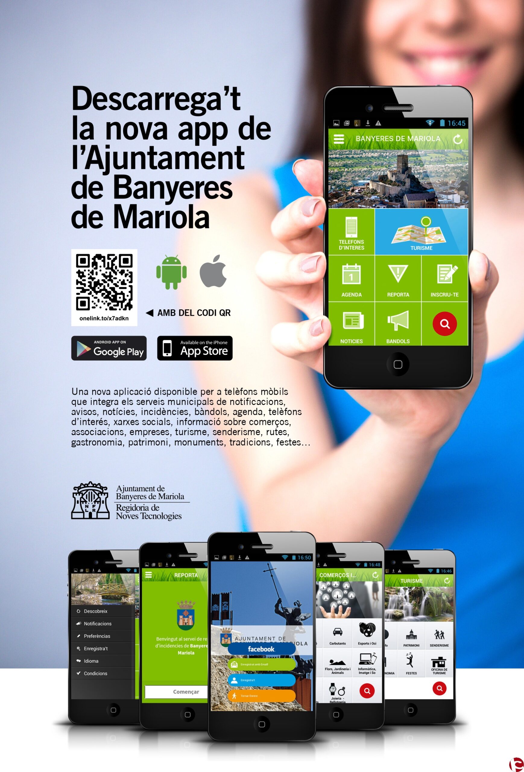 Una nova aplicació de l?Ajuntament de Banyeres de Mariola està ja disponible per als telèfons mòbils. El programa integra els serveis municipals de notificacions, avisos, notícies, incidències, bàndols, agenda, telèfons d?interés, xarxes socials, ràdio municipal online, informació sobre comerços, associacions, empreses, turisme, senderisme, rutes, gastronomia, allotjaments, museus, patrimoni, monuments, tradicions, festes, l?oratge, medi ambient, etc.