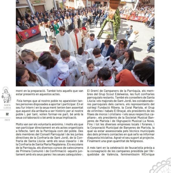 Per a nosaltres era utòpic pensar que tantíssimes persones s’implicarien directament, bé ajudant amb els preparatius, bé fent acte de presència en els actes organitzats -en la preparació de la Plaça Major i en la rebuda de les campanes, en la solemne celebració de la eucaristia, en l’acte de consagració a la Plaça Major, en la signatura de l´acta que deixarà constància per a la història, etc.-, o bé contribuint i aconseguint que el projecte d’oferir al nostre poble un nou conjunt de campanes representara una realitat i que els actes preparats al voltant de les nostres noves campanes suposaren un èxit. Un dia per a la història i per al record com així va quedar de manifest, tant per la seua importància com per la col·laboració, la participació i l’assistència.