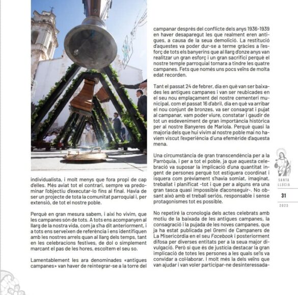 Tant el passat 24 de febrer, dia en què van ser baixades les antigues campanes i van ser reubicades en el seu nou emplaçament del nostre cementeri municipal, com el passat 16 d’abril, dia en què va arribar el nou conjunt de bronzes, va ser consagrat i pujat al campanar, vam poder viure, constatar i gaudir de tot un esdeveniment de gran importància històrica per al nostre Banyeres de Mariola. Perquè quasi la majoria dels que hui vivim al nostre poble mai no havíem viscut l’experiència d´una efemèride d’aquesta mena.