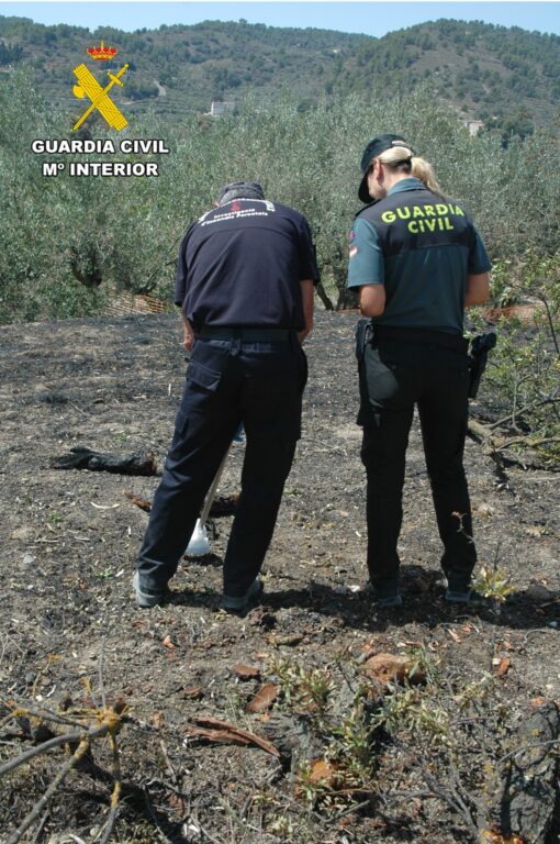 (S’adjunten imatges de la presa de mostres en el lloc dels fets dels membres del SEPRONA (Servei de Protecció de la Naturalesa) de la Guàrdia Civil d’Alacant al costat del GOIIF (Grup Operatiu d’Investigació d’Incendis Forestals) de la Generalitat Valenciana)