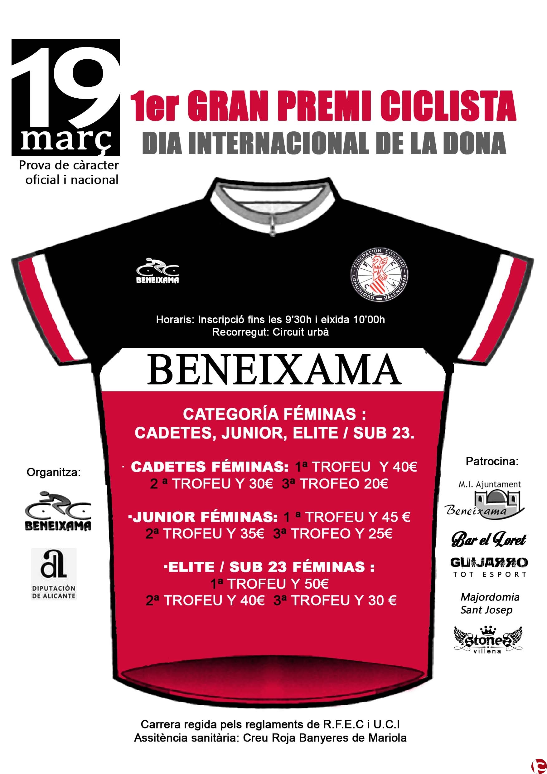 El CC Beneixama en colaboración con la Diputación de Alicante y la FCCV ha organizado este año la primera edición del Gran Premi Ciclista Dia Internacional de la Dona que se celebrará el próximo 19 de marzo en Beneixama para todas las categorías de féminas, desde cadetes hasta elite, a partir de las 10 de la mañana.