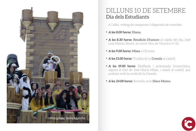 A les 19:00 Desfilada i ambaixada humorística segons el text de José Maria Milán, i assalt al castell que va acabar amb la cordà de la Cresola