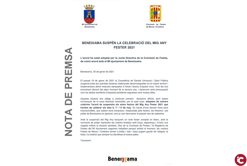 A causa de la crisi sanitària provocada pel Covid-19, l’Ajuntament de Beneixama i la Junta Directiva de la Comissió de Festes han acordat la suspensió dels actes festius del Mig Any Fester 2021 que s’havien de celebrar els dies 6, 7 i 13 de març.