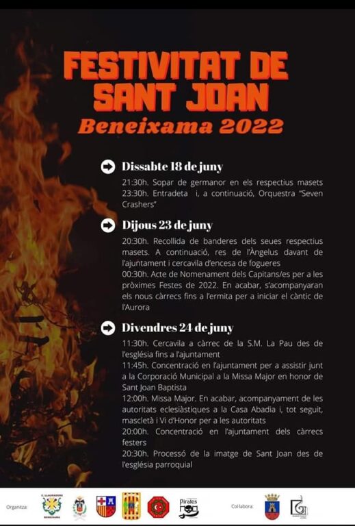 L’Ajuntament de Beneixama ha preparat diversos actes per a celebrar la festivitat de Sant Joan els pròxims dies 23 i 24 de juny. Tot començarà el dijous a les 20:30 hores quan els festers agafen les banderes dels seus respectius masets. A continuació, res de l’Àngelus davant de l’ajuntament i cercavila d’encesa de fogueres. A les 00:30 hores, tindrà lloc l’acte de Nomenament del Capitans i Capitanes per a les pròximes Festes de 2022. En acabar, s’acompanyaran els nous càrrecs fins a l’ermita per a iniciar el càntic de l’Aurora.