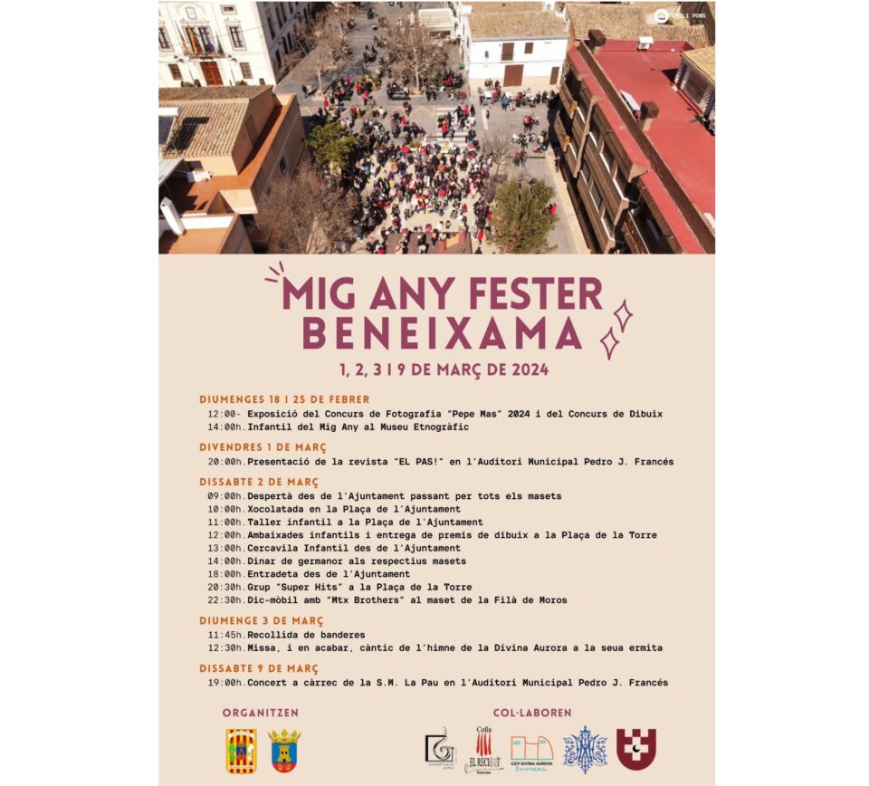 La pròxima setmana, comencen els actes per a la celebració de «Mig Any Fester» a la localitat de Beneixama. Les celebracions seran del 18 de Febrer al 9 de Març 2024 i el programa d´actes contempla moltes activitats per a menuts i adults.