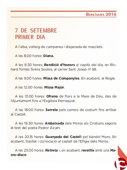 Hui, dia 7 de setembre, a les 9:00 h, Missa de Companyies . Al seu termini El Rogle (evolucions militars). Ahir, dia 7, es va celebrar la tradicional Ofrena de flors a la Mare de Déu, des de l´Ajuntament fins a l´Esglèsia Parroquial.