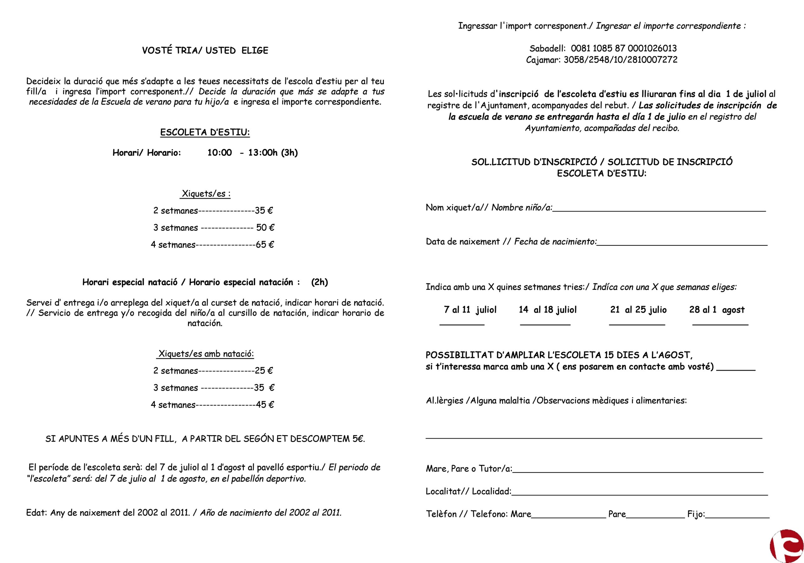 El plazo de inscripción finaliza el próximo día 1 de julio. Las fichas de inscripción se presentarán cumplimentadas, junto con el recibo de pago en el registro del Ayuntamiento en horario de atención al público.