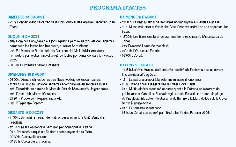 Beniarrés es prepara per a transformar els seus carrers en un esclat de música, color i pólvora amb l’arribada de les seues festes patronals, que se celebren del 14 al 18 d’agost en honor a la Mare de Déu de la Cova Santa. Durant quatre intenses jornades, el poble multiplica la seua població amb visitants de tota la comarca que se sumen al fervor i l’alegria dels veïns.