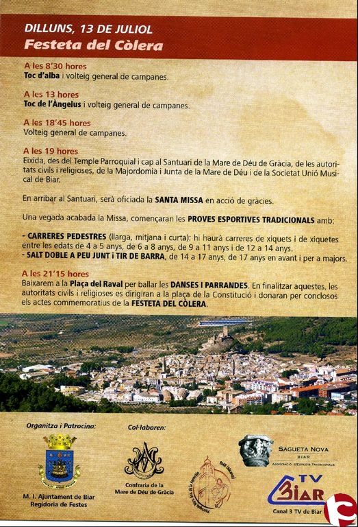 Des de la regiduria de Festes ens fan aplegar els actes propers. El 9, 10, 12 i 13 de julol se celebren els actes en commemoració de Sant Cristòfol i la Festeta del Còlera respectivament, a continuació es mostra el Programa d´actes.