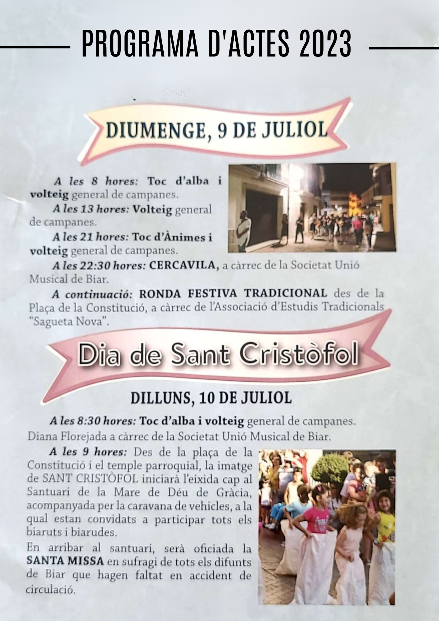 El dissabte 9 de juliol comença la festa. A les 10.30 de la nit, tindrà lloc una cercavila a càrrec de la Societat Unió Musical de Biar, seguit de la tradicional ronda festiva pels seus carrers. El dilluns 10 juliol, dia de Sant Cristòfol, la imatge del patró dels conductors serà pujada al matí al santuari, acompanyada per vehicles. Finalitzada la missa en el santuari, es celebrarà el “Esmorzar de Saquet”, durant el qual s’obsequiaran als assistents amb vi i olives. A les 10.45 hores es celebraran les proves esportives tradicionals.