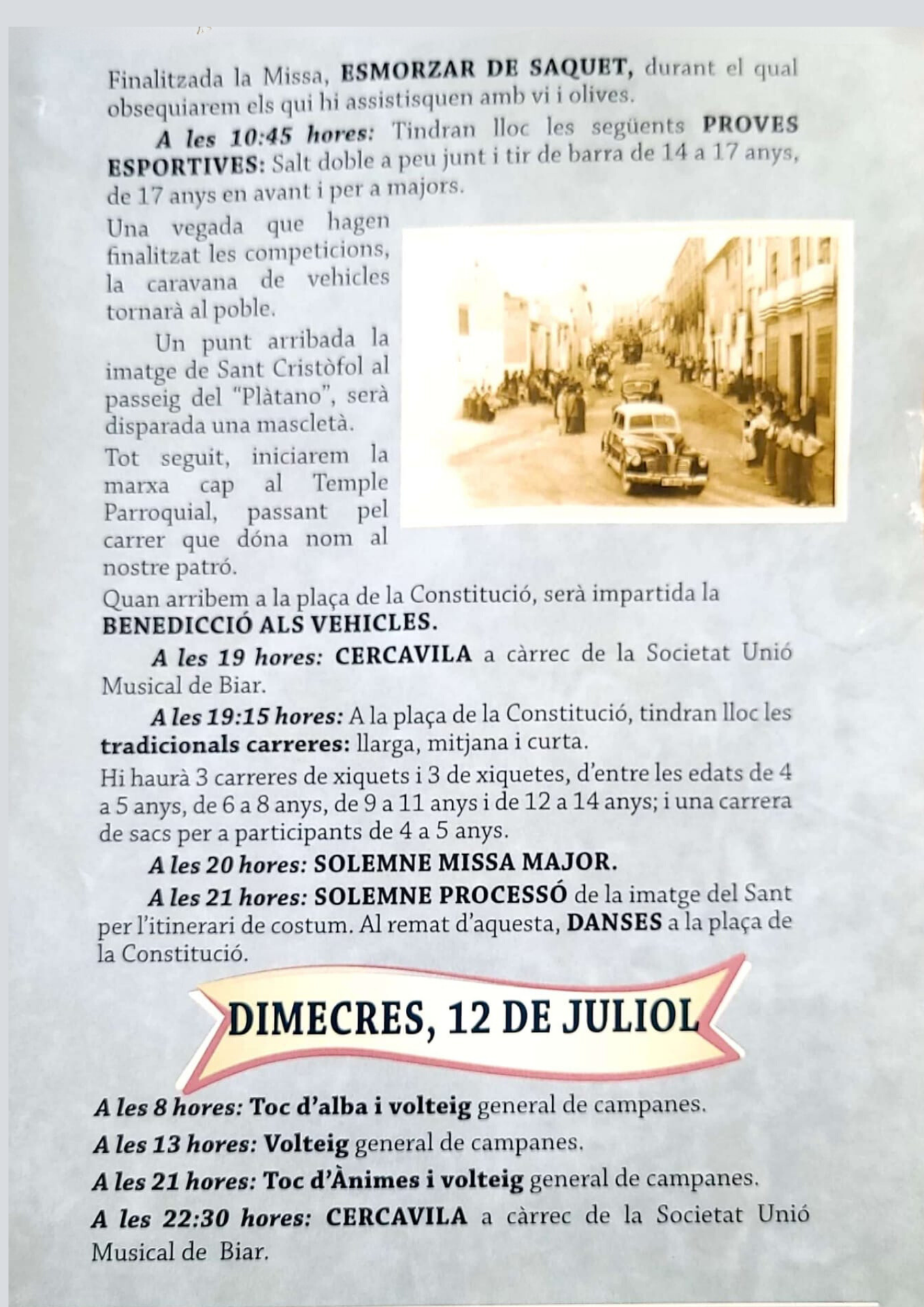 Biar celebrarà la festivitat del patró Sant Cristòfol (10 de juliol) i la Festeta del Còlera (13 de juliol)