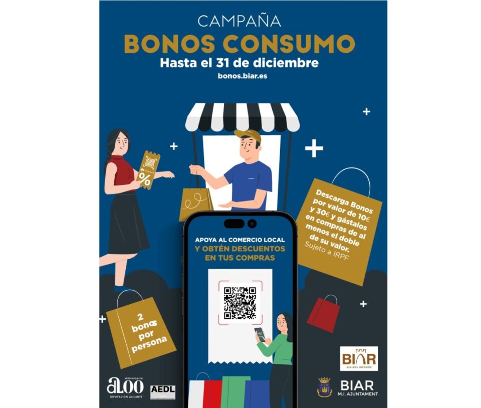 - 14/12/2022. El Ayuntamiento de Biar lanza una campaña de bonos consumo de Navidad, que comienza mañana 15 de diciembre. El reparto de los bonos se realizará a través de la plataforma: bonos.biar.es/ , a partir de las 15:00 horas.
