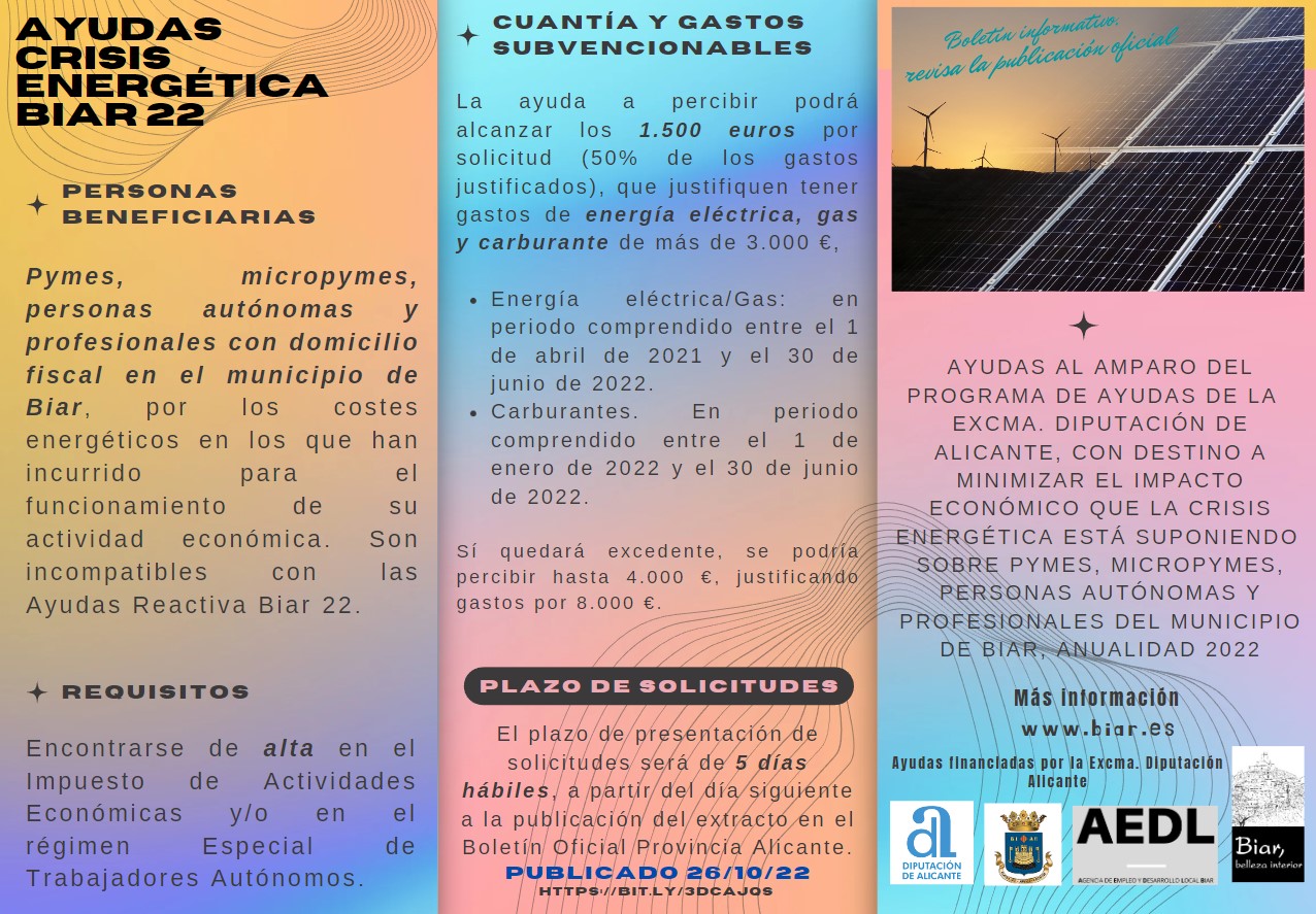 27/10/202. El Ayuntamiento de Biar, a través de la Agencia de Desarrollo Local, ha abierto el plazo de presentación de solicitudes al Plan de Ayudas Diputación-Ayuntamiento 2022 dirigidas a pymes, micropymes, pequeños empresarios autónomos y profesionales con el objetivo de minimizar el impacto económico de la crisis energética.