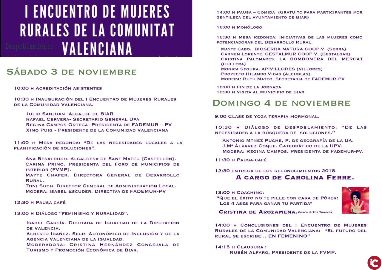 Los próximos días 3 y 4 de noviembre tendrá lugar en la localidad de Biar el I Encuentro de Mujeres Rurales de la Comunidad Valenciana. Tras cuatro años de recorrido de la Federación de Asociaciones de Mujeres Rurales del País Valenciano, FADEMUR-PV, es el momento de crear un foro de debate en el que se hable de desarrollo rural, feminismo, despoblación, emprendimiento o artesanía de nuestra tierra.