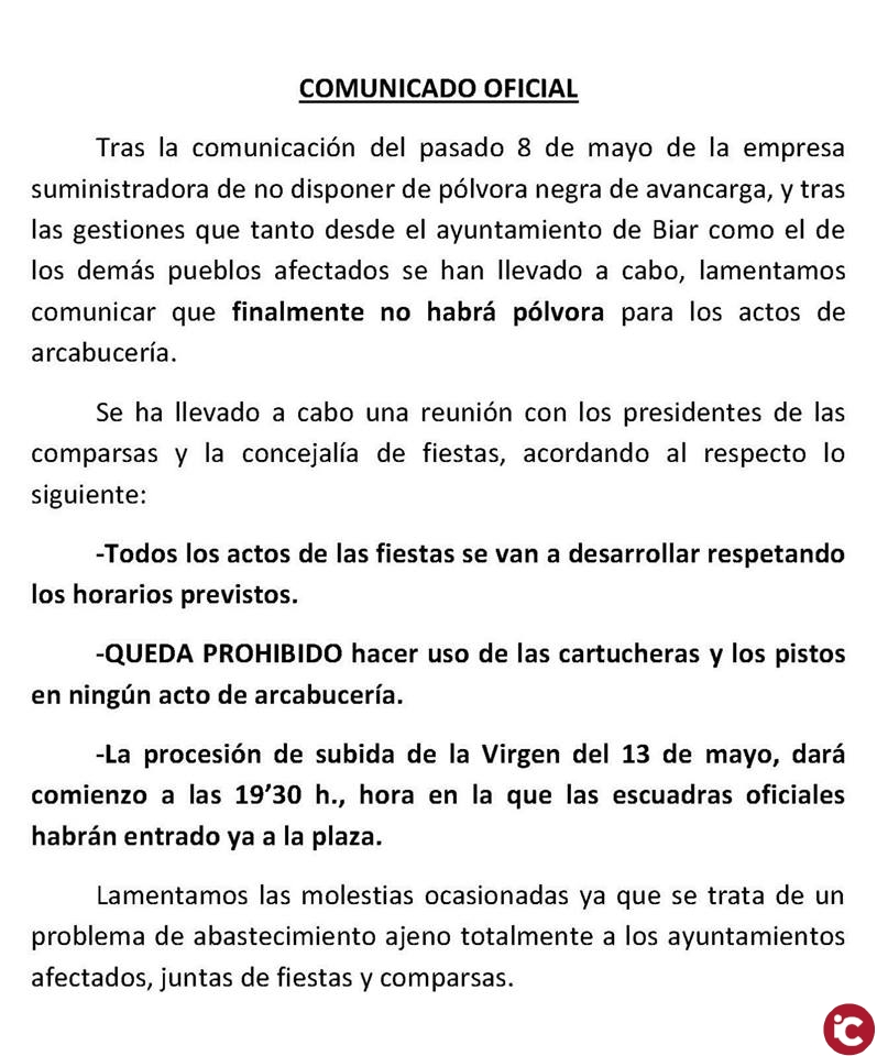 Finalmente no habrá pólvora para los actos de arcabucería. Mañana empiezan las Fiestas de Moros y Cristianos. Tras la notificación presentada por la empresa suministradora de pólvora el 8 de mayo, hoy ha tenido lugar una reunión en la sede de la Subdelegación de Gobierno en Alicante. Biar, Petrer, Muro y Villena son las poblaciones afectadas.