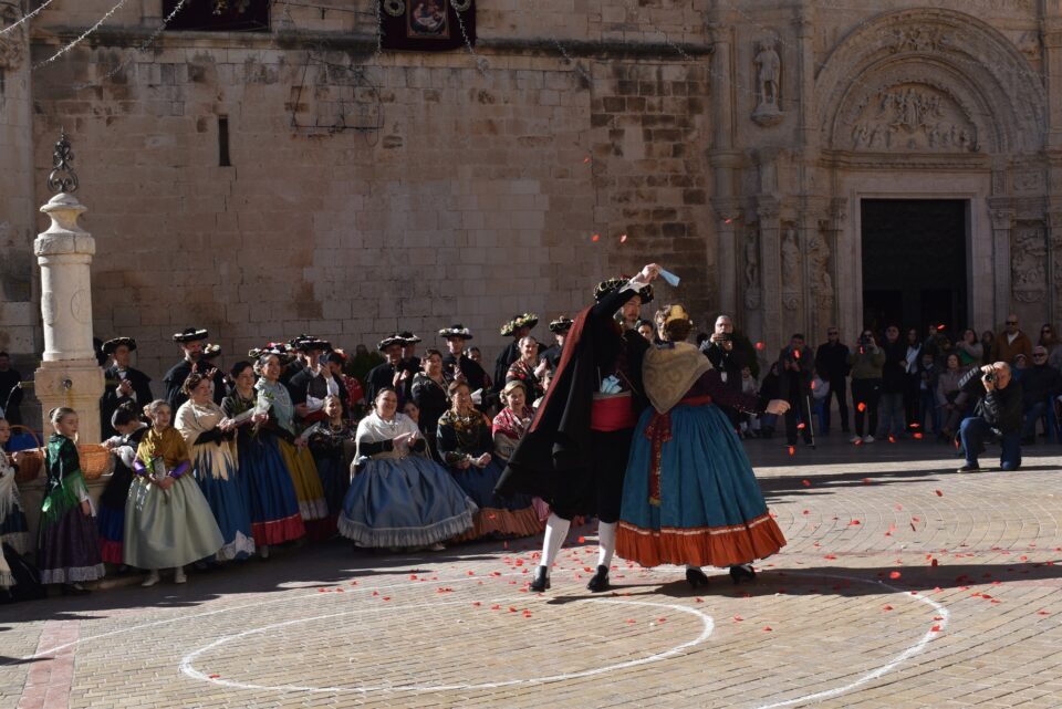 Un dels moments més emblemàtics de la celebració va ser l’inici dels balls amb la Volteta de la Reina. En aquest antic ritual, el rei llança peladilles sobre el cap de la reina, un gest carregat de simbolisme que s’associa a la fertilitat i l’abundància i que s’ha mantingut inalterable al llarg del temps. Durant l’acte central, els Reis van obrir el ball en un cercle íntim davant dels bancs de fusta que envolten la font de la plaça, abans de donar pas als virreis i a la resta de parelles en el denominat cercle gran.