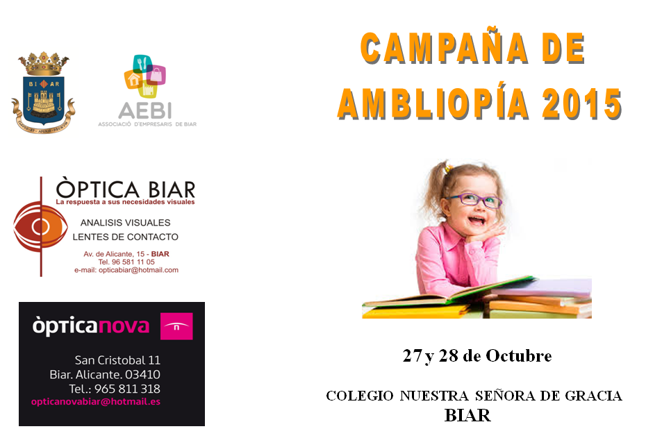 Este año las Concejalías de Sanidad y Educación del M.I. Ayuntamiento de Biar, en colaboración con los Ópticos-Optometristas, Òptica Biar i Òptica Nova pertenecientes a la Associació de Empresaris de Biar AEBI ponen en marcha la Campaña anual de Ambliopía que se efectúa a niños/as de 2º de infantil ( 4 años)