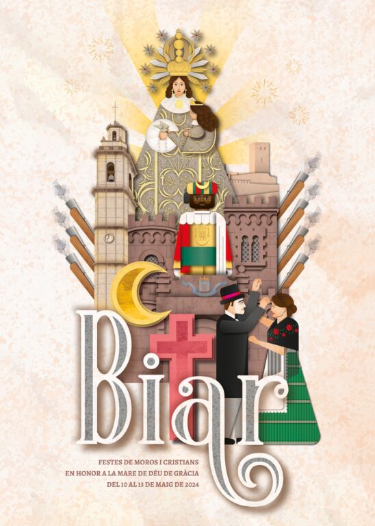 L’acte va començar amb el descobriment del cartell de festes obra de Mº Dolores Martínez. L’ autora va explicar la idea gràfica, que li ha portat a plasmar gran part dels elements característics en la imatge que presenta les festes locals en 2024. “Finalment, em vaig decidir per una composició triangular, també està cuidada la simetria, encara que apareguen diferents elements a dreta i esquerra com per exemple els arcabuceros quatre en una i tres en una altra, mantenint el nombre de comparses de tots dos bàndols”, va explicar, Així mateix, Martínez ha comptat les festes de Biar en amb afectes i jugant amb les textures, alguna cosa que l’apassiona.