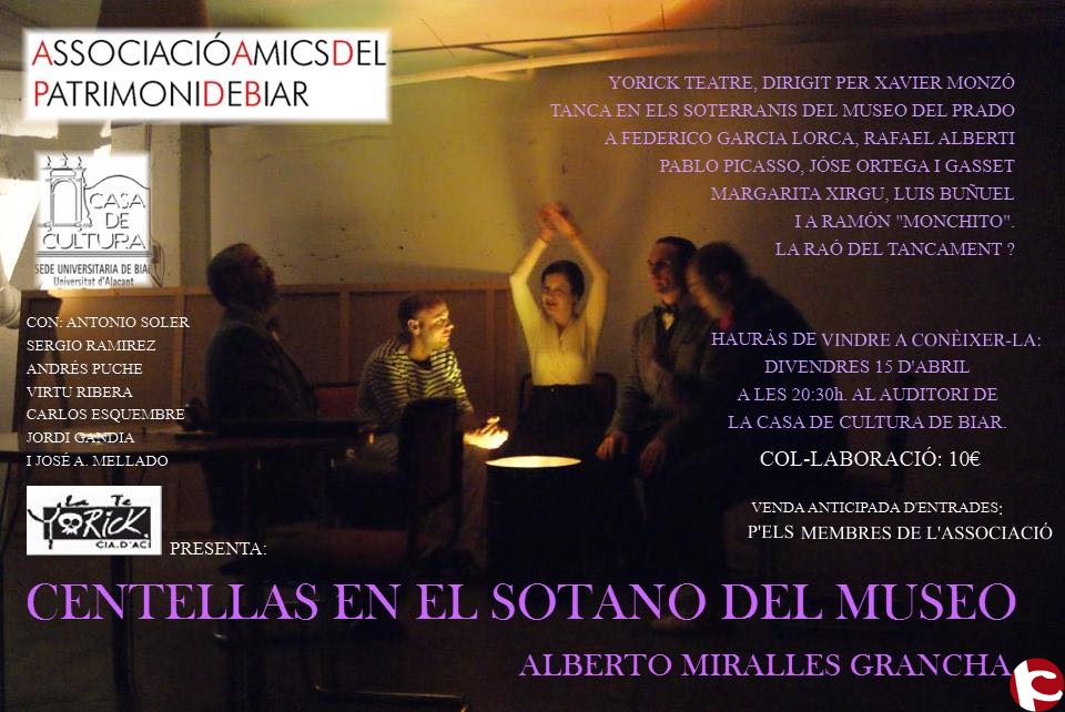 L´Associació dAmics del Patrimoni de Biar ha organitzat la representació teatral de Centellas en el sótano del museu per al proper 15 dabril a les 20:30 hores a lauditori de la Casa de Cultura. Lobra, original dAlberto Miralles, estarà dirigida per Javier Monzó i la interpretació correra a càrrec del grup de teatre Yorick.