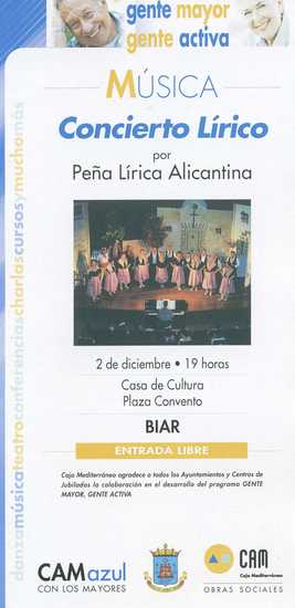 El próximo domingo día 2 de diciembre, a las 19 horas, se llevará a cabo en el Auditorio de la Casa de Cultura un Concierto Lírico a cargo de la Peña Lírica Alicantina, gracias a la colaboración de la CAM y a la Concejalía de Cultura.