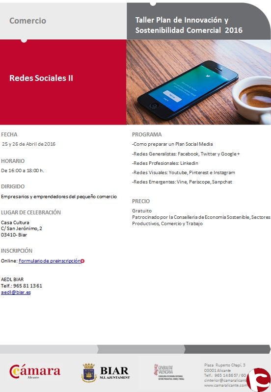 Dentro del plan de innovación y sostenibilidad comercial en el 2016, se va a realizar un curso de redes sociales para el sector comercial (autónomos, trabajadores y emprendedores) en Biar.