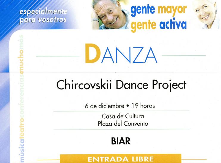 Con la colaboración de la Obra Social de la CAM, (Gente Mayor, Gente Activa) y la Concejalía de Cultura, el próximo miércoles 6 de diciembre, a las 19 horas, tendrá lugar en la Casa de Cultura de Biar una actuación de Danza, de la mano de CHIRCOVSKII DANCE PROJECT.