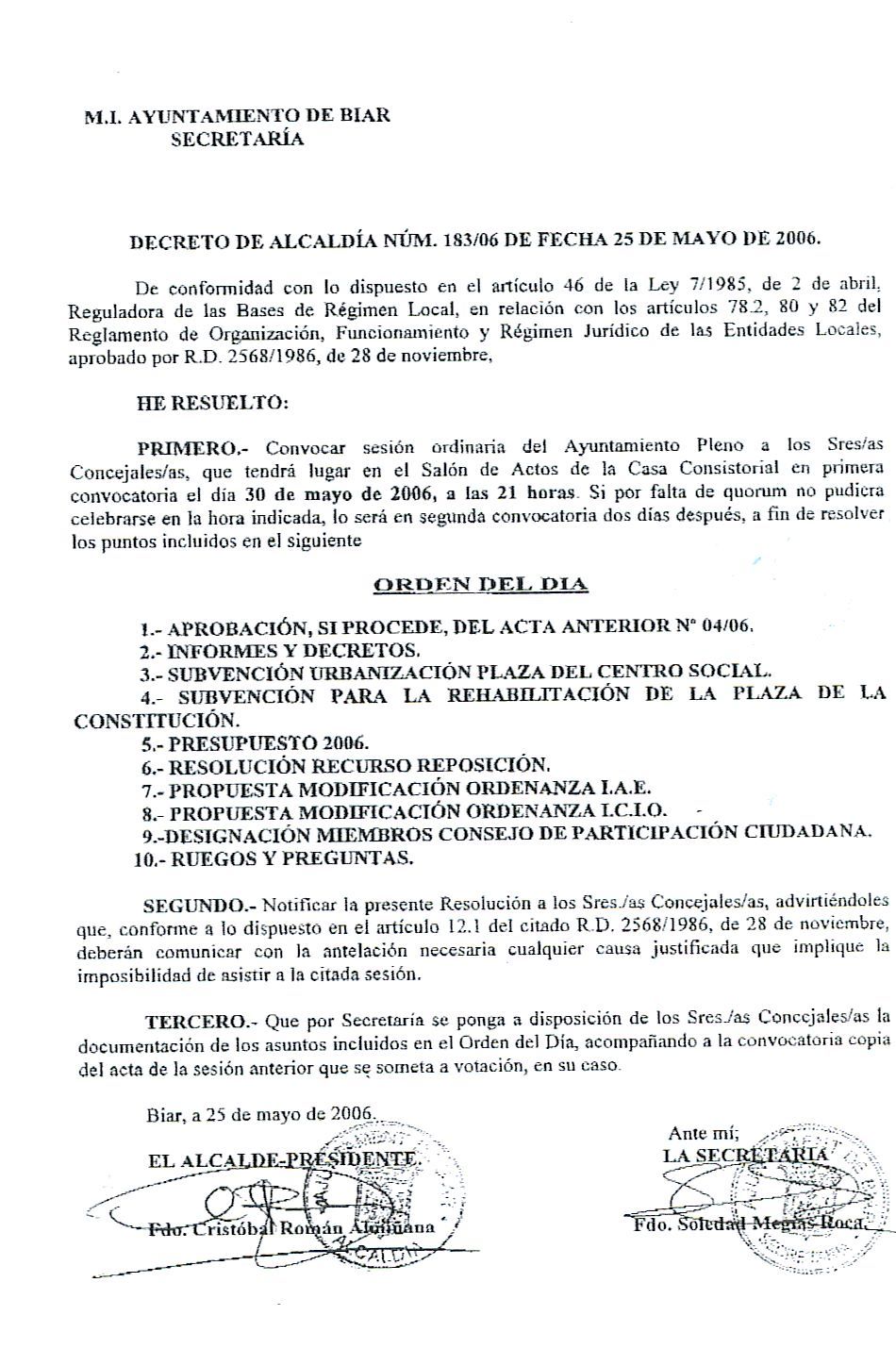 Adjuntamos a modo de imagen el contenido del Decreto de Alcaldía de la localidad de Biar, número 183/06, de fecha 25 de Mayo de 2006.