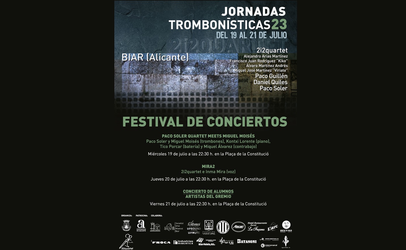 Les jornades trombonísticas de Biar, en la qual es combina formació i concerts, comencen avui i s’allargaran fins al pròxim 21 de juliol. 2i2 quartet són els encarregats de donar forma a aquests cursos, que compten amb classes col·lectives i individuals i tallers en la modalitat de trombó tenor i baix.