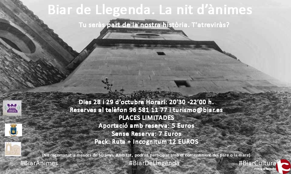 Aproximadamente 10 actores te harán vivir el misterio de pasear por las calles de Biar. Este año las rutas son nuevas y diferentes, además el sábado habrá un pase a las 00:00 con el espectáculo INCOGNITUM en la Casa de Cultura, una experiencia totalmente distinta, cuesta 10, pero si hacéis el pack ruta- espectáculo costaría solo 12 para adultos y 10 para niños de 11 a 17 años, el pack lo podéis disfrutas dos personas diferentes.