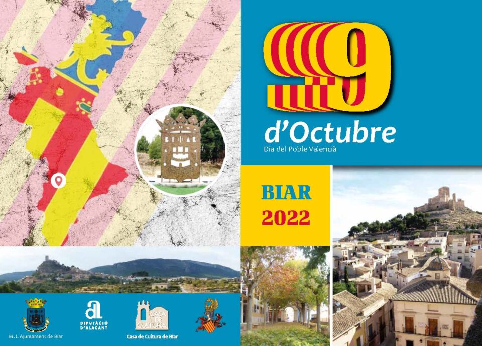 Un any més, Biar celebra el dia de la Comunitat Valenciana. Els dies 8 i 9 d´Octubre es podrà gaudir d´activitats per a xiquets i xiquetes, representacions teatrals, proves esportives, l´acte intitucional i un castell de focs d´artifici. Enguany el premi 9 d´Octubre recau en Alfonso Camañes Quevedo, un reconeixement per la seua labor cultural i educativa al llarg de la seua vida.