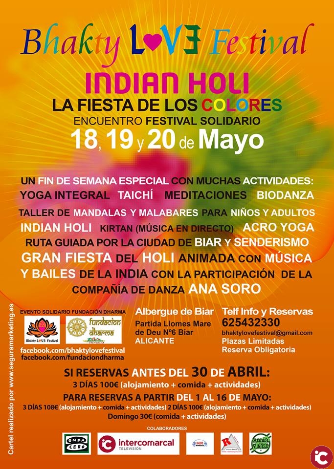 Kirtan con música en directo, Acro yoga -Ruta Guida por la Cuidad de Biar y Senderismo, Menú Vegetariano- Gran fiesta del Holi aminada con música y bailes de la India con la participación de la compañía de Danza Ana Soro