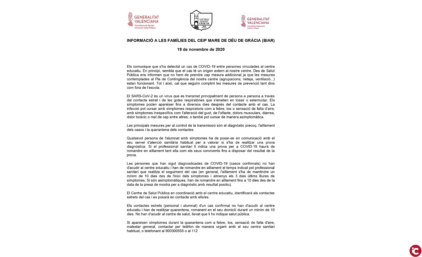Els comunique que s’ha detectat un cas de COVID-19 entre persones vinculades al centre educatiu. En principi, sembla que el cas té un origen extern al nostre centre. Des de Salut Pública ens informen que no hem de prendre cap mesura addicional ja que les mesures contemplades al Pla de Contingència del nostre centre (agrupacions, neteja, ventilació…) estan funcionant. Tot i això, cal que seguim complint les mesures de prevenció tant dins com fora de lescola.