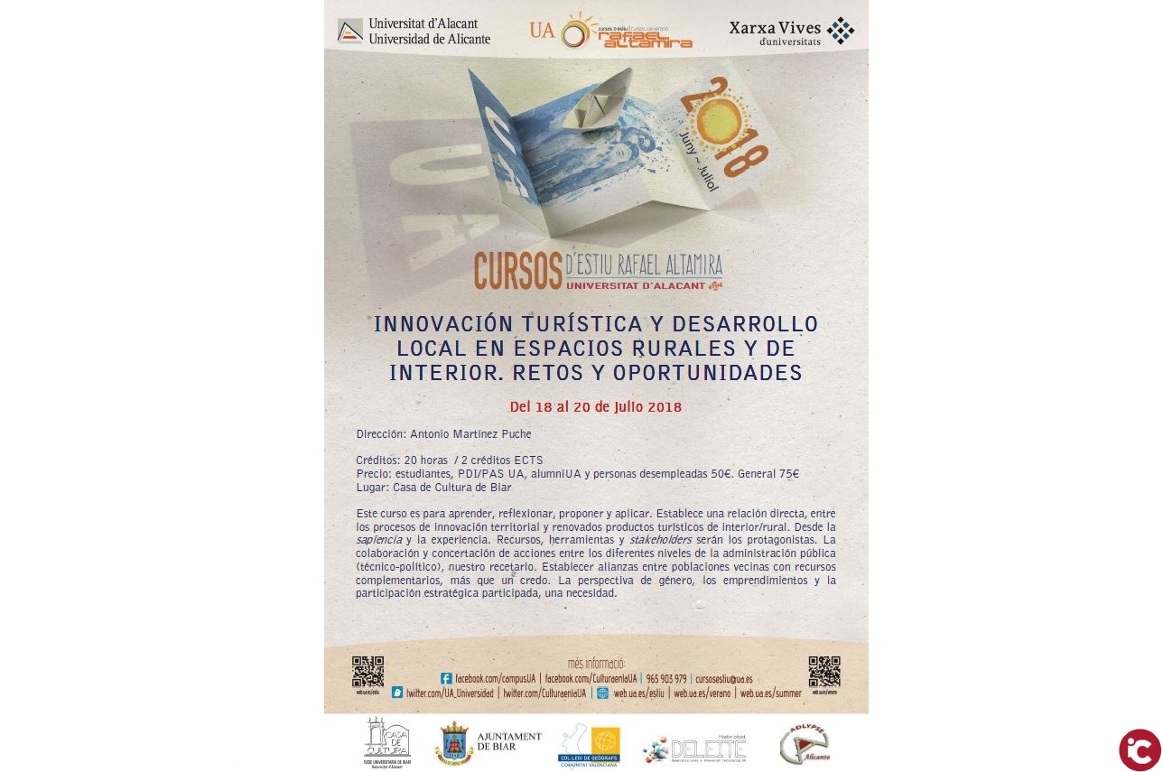Aquest curs pretén aprendre, reflexionar, proposar i aplicar. Estableix una relació directa entre els procediments d’innovació territorial i renovats productes turístics d’interior/rural. Des de la sapiència i l’experiència. Recursos, eines i stakeholders hi seran els protagonistes. La col·laboració i concertació d’accions entre els diferents nivells de l’administració pública (tècnic-polític), el nostre receptari. Establir aliances entre poblacions veïnes amb recursos complementaris, més que un credo. La perspectiva de gènere, les iniciatives i la participació estratègica participada, una necessitat