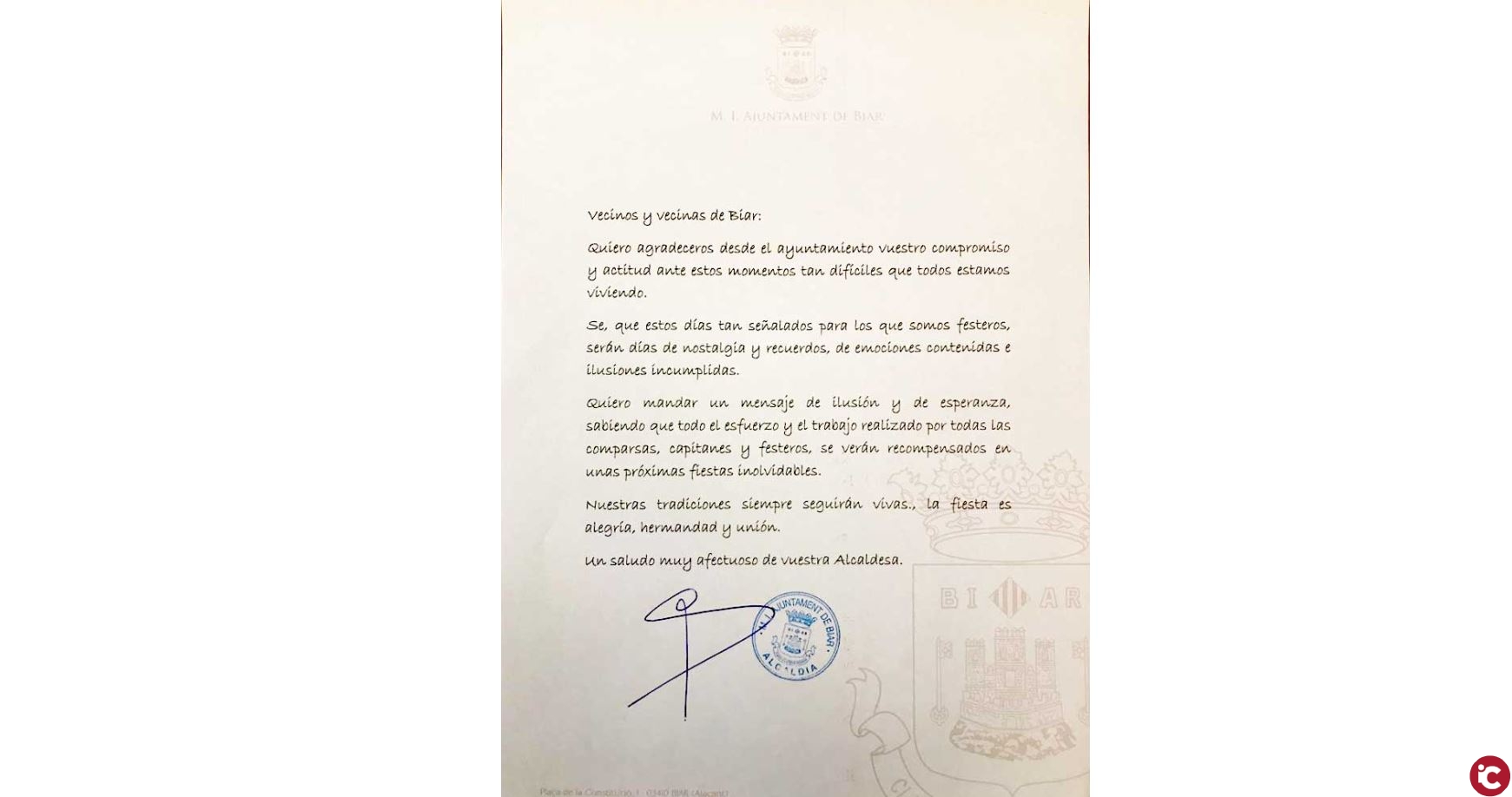 08/05/2020. La alcaldesa de Biar, Magdalena Martínez, ha enviado una carta de ánimo a sus vecinos, en unos días cercanos a las fiestas de Moros y Cristianos, en la que agradece “vuestro compromiso y actitud ante estos momentos tan difíciles que todos estamos viviendo”. Hace tan sólo una semana, por parte del Ayuntamiento, las comparsas y la cofradía de la Mare de Déu de Gracia se tomó la decisión de suspender los festejos patronales. Un acuerdo, que a pesar de ser esperado por la población, supuso un mazazo emocional.