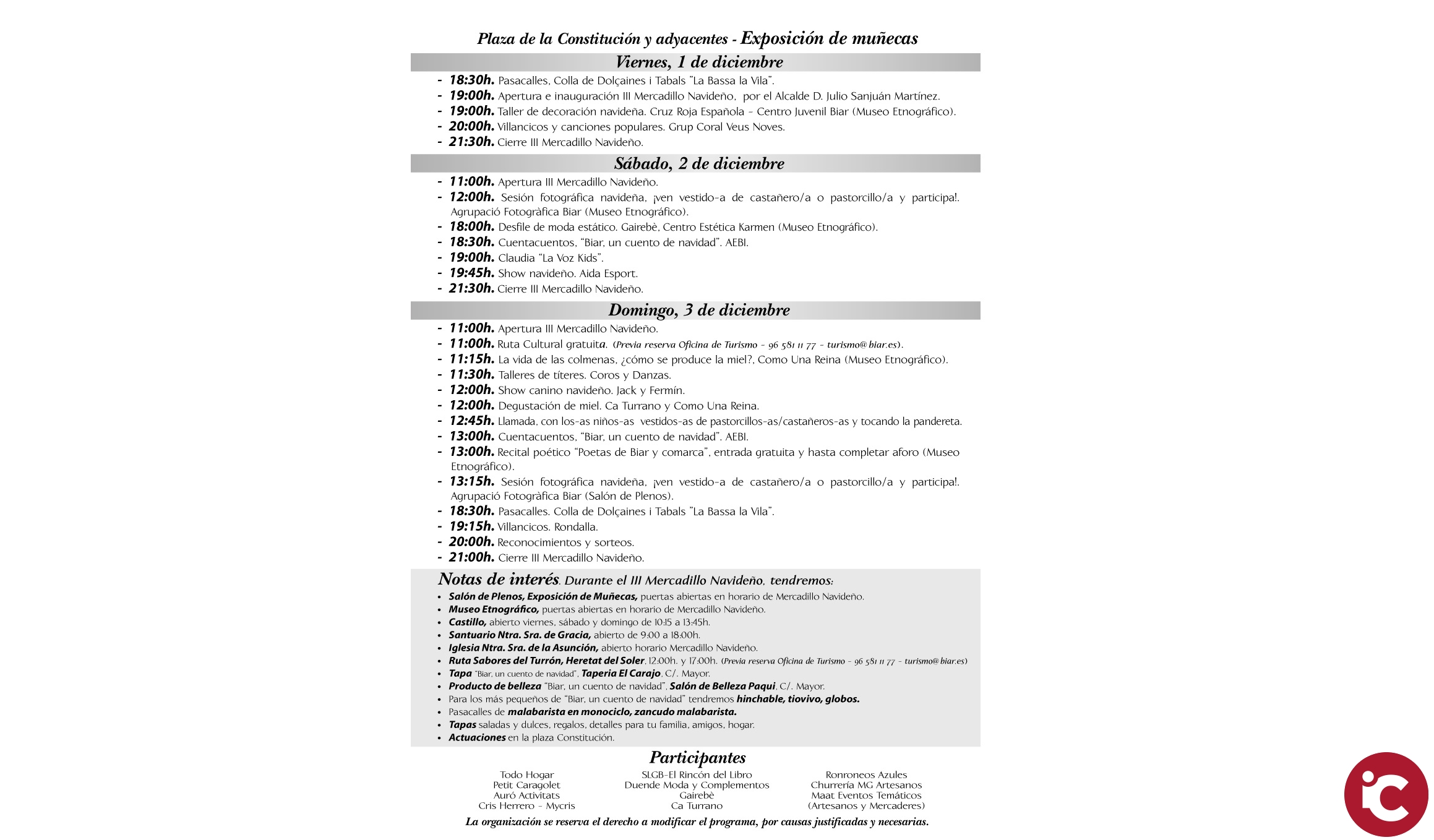 Una exposició de nines, la ruta de sabors, tapeo, productes de bellesa, cercaviles i actuacions són entre altres coses els components que portarà la 3a edició del Mercat nadalenc «Biar un cuento de navidad» organitzat des de l’Ajuntament de Biar amb la col·laboració d’AEBI. A continuació el programa complet d’activitats que se celebraran a Biar els dies 1, 2 i 3 de desembre. El cartell anunciador d’enguany ha sigut obra d’Alejandro Paz Poveda.
