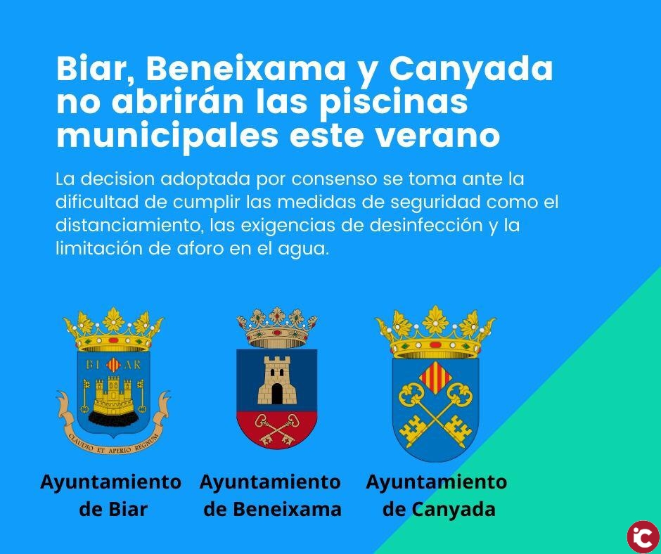 Las concejalías de Deportes de Biar, Beneixama y Cañada han acordado no abrir las piscinas púbicas este verano. Por unanimidad y de forma conjunta, los tres municipios han anunciado que el cierre de estas instalaciones municipales se ha tomado ante la dificultad de cumplir las medidas de seguridad como el distanciamiento, las exigencias de desinfección y la limitación de aforo en el agua.