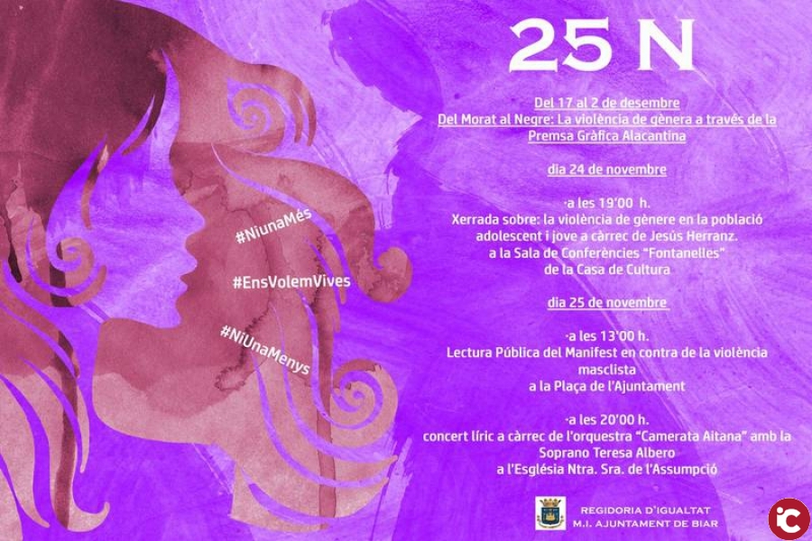 El dia 25 a les 1300 h. a la Plaça de la Constitució es va llegir un manifest per fer públic el rebuig del poble de Biar cap a qualsevol forma de violència masclista.