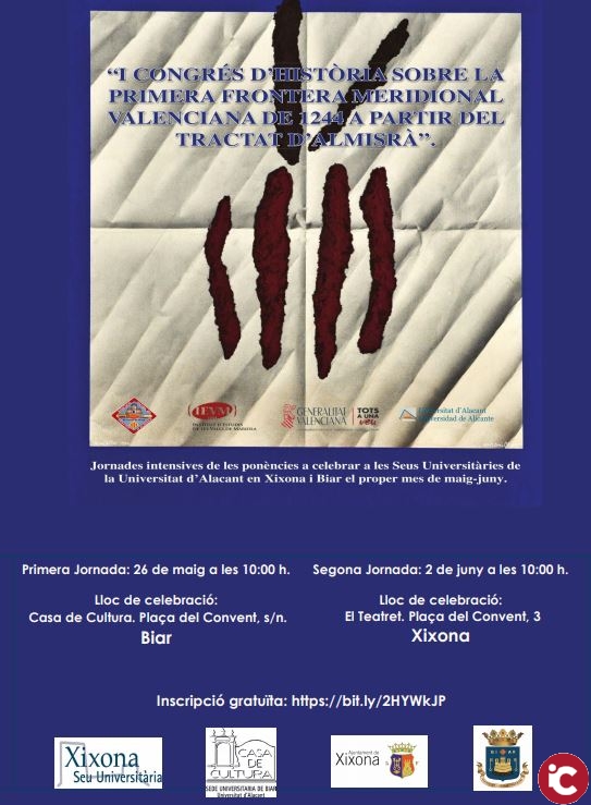Experts en història i patrimoni arquitectònic participen en el I Congrés dHistòria dedicat a la Primera Frontera Meridional Valenciana, que va quedar establida el 1244 en el tractat dAlmisrà. La trobada sinaugura demà dissabte, 26 de maig, a les 10 hores, a la Seu de la Universitat dAlacant a Biar (Casa de Cultura. Plaça del Convent, Biar) i constarà duna segona sessió el 2 de juny a la Seu Universitària de Xixona (El Teatret. Plaça del Convent, 3). Experts i acadèmics oferiran diferents ponències sobre història, patrimoni arquitectònic i també temes dactualitat, dinterès comú per a totes les poblacions que van quedar delimitades en aquesta part oriental de la Península amb la frontera establida en el tractat dAlmisrà el 1244, des de Cofrents fins a Xixona, i pel barranc dAigües fins al mar, on avui es troba la vila del Campello.
