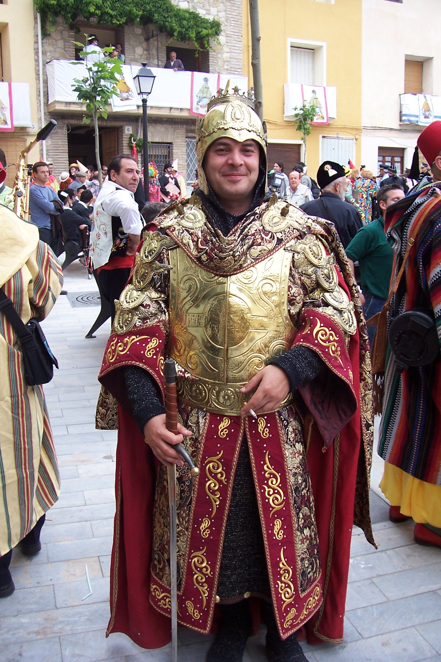 Festeros empezaron a partir en procesión hacia el santuario a las ocho en punto de la tarde. A esa hora la Plaza era ya el mismo hervidero de gente que en los días anteriores. Una a una, despacio, las comparsas cristianas fueron haciendo camino por la calle Mayor. Después, también hacía lo propio el bando de la Media Luna, salvo los Moros Nous, quienes, cuando parecía que iban a dejar también la Plaza, volvieron con paso sereno hacia ella.