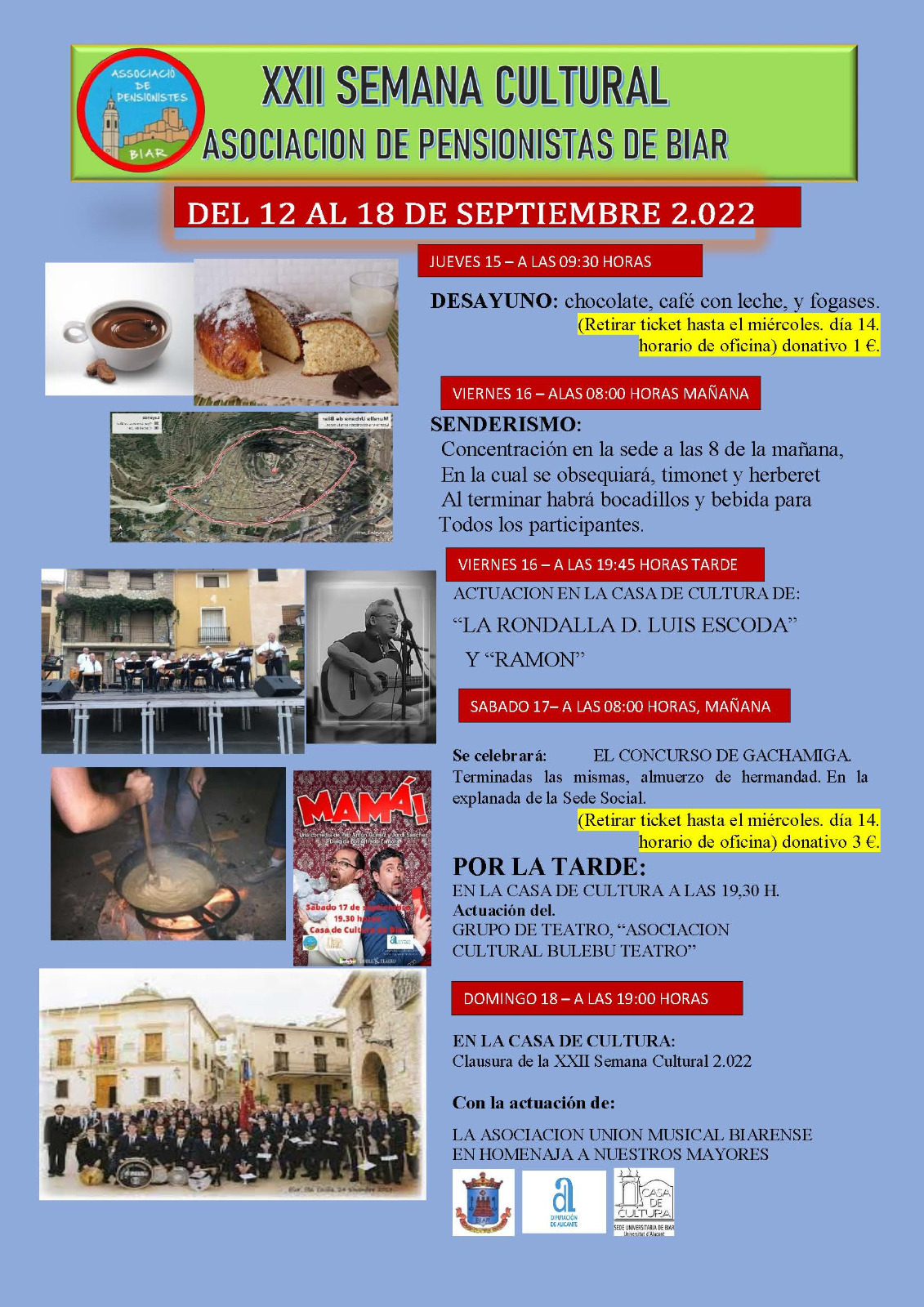 L’associació de pensionistes de Biar, celebra fins al dia 18 de setembre la XXII setmana cultural. Destaquem entre els dies del 16 al 18 de setembre activitats com a senderisme, actuació de la rondalla, esmorzar de germanor en el matí del dissabte degustant les típiques gatxamigues, teatre i ball, així com l’esperat homenatge als nostres majors.