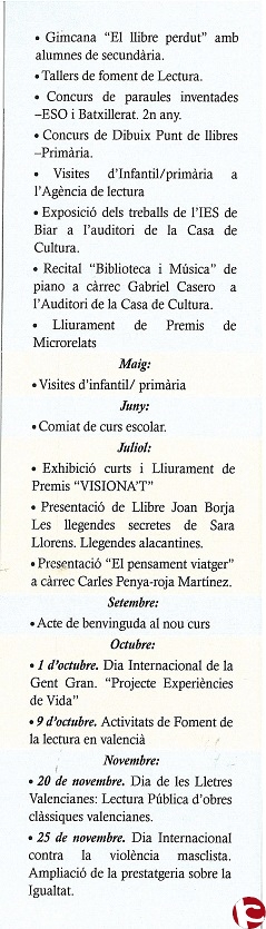 Per tot açò volem informar que Divendres 23 de desembre a les 12’00 h. a l’Agència de lectura de Biar presentarem el Punt de Llibre que s’ha elaborat des de la Regidoria de Cultura per a felicitar el Nadal a tots els usuaris i usuàries de l’Agència de Lectura “Ricardo Martínez Guillén” de Biar. Aquest punt de llibre és el resultat dels Premis que es van lliurar amb motiu del Dia del Llibre: Paraules Inventades i Dibuix Punt de Llibre. Les guardonades van ser Alba Satorres Luna, Andrea Francés Penadés, Lidia Soriano i Paloma Guillén Sarrió. Des de la Regidoria volem felicitar-les de nou i agrair la seua faena. A més a més, volem destacar que el punt de llibre també servirà per a informar sobre la programació de l’Agència de Lectura per al 2017.