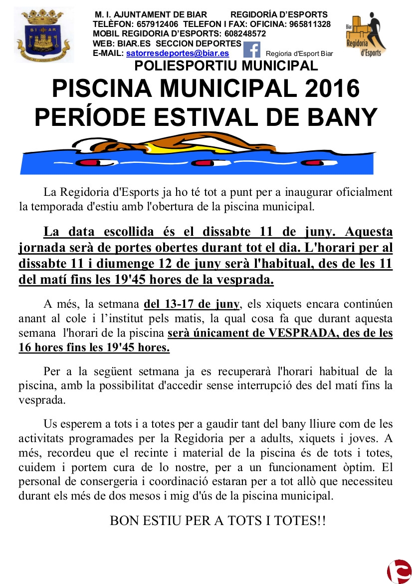 Us esperem a tots i a totes per a gaudir tant del bany lliure com de les activitats programades per la Regidoria per a adults, xiquets i joves. A més, recordeu que el recinte i material de la piscina és de tots i totes, cuidem i portem cura de lo nostre, per a un funcionament òptim. El personal de consergeria i coordinació estaran per a tot allò que necessiteu durant els més de dos mesos i mig d´ús de la piscina municipal.